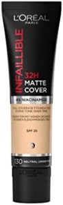 Base de maquillaje mate de alta cobertura L’Oréal Paris, resistente al agua, de larga duración, ligera y matificante. SPF 25. Infaillible 32H Matte Cover. Tono 130 Neutro. 30 ml.