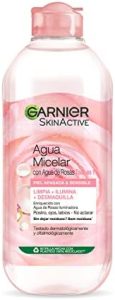 Agua micelar GARNIER Skin Active con agua de rosas, desmaquilla, limpia e ilumina la piel sensible y apagada en un solo paso. Apto para rostro, labios y ojos. Presentación de 400 ml.