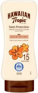 Loción Solar Hawaiian Tropic Satin Protection Ultra Radiance SPF 15. Protección y suavidad con aroma a frutas tropicales. 180ml.