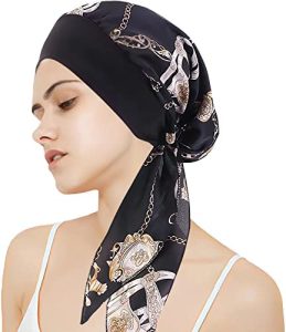 Conjunto de pañuelo, tocado y gorro para mujer en negro con cadena, ideal para quimioterapia.
