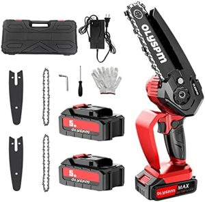 Motosierra eléctrica OLYSPM de batería recargable de 6 pulgadas para poda de árboles, incluye cadenas y baterías.