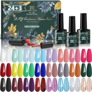 Kit de 27 esmaltes de uñas Anicco con gel UV LED, 24 colores semipermanentes y purpurina arcoíris. Incluye base, capa superior brillante y mate.