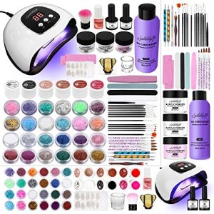 Kit completo para principiantes: Colección de pintauñas semipermanente con lámpara LED de 48W, kit de uñas acrílicas de 90ML y set de polvos, kit de uñas semipermanentes en 6 colores con 2 bases y top coat.