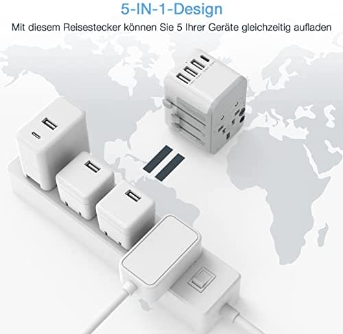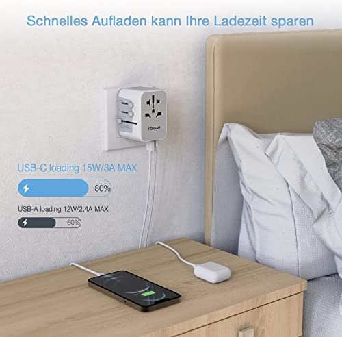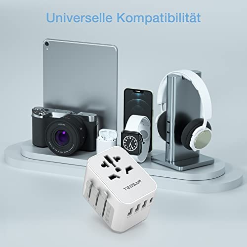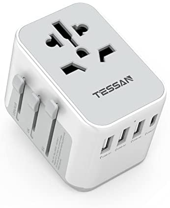 El adaptador de viaje TESSAN es una solución universal para cargar dispositivos en más de 224 países gracias a sus enchufes integrados en UE, Reino Unido, Australia y EE. UU. Además, cuenta con 3 puertos USB, 1 tipo C, doble fusible y persianas de seguridad. No es un conversor.