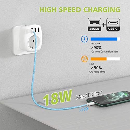 De entre estos productos, destaca el adaptador de viaje LENCENT que es capaz de cargar simultáneamente cinco dispositivos con alta velocidad, gracias a su diseño 5 en 1 que incluye un enchufe CA (Schuko europeo de 2-pin) + 1 puerto tipo C + 3 puertos USB. Este adaptador es totalmente seguro, ya que está hecho de materiales a prueba de fuego y ofrece una protección total de 360° para su familia y sus dispositivos.