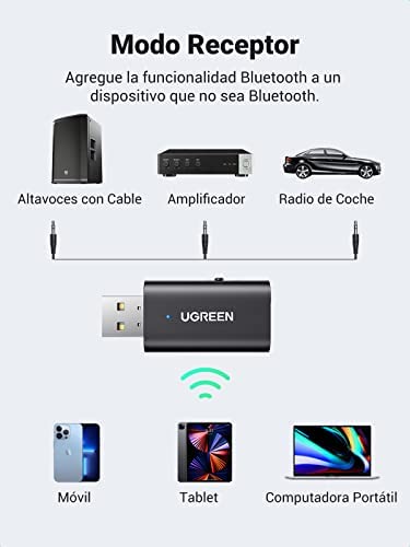 Adaptador UGREEN Bluetooth 5.1 con cable de audio 3.5mm para TV, amplificador, móvil, coche, altavoces y auriculares.