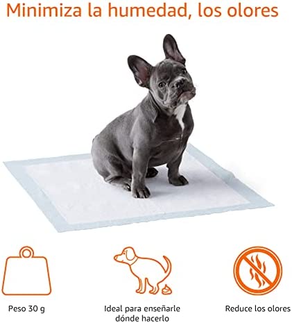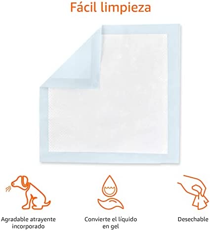 Las almohadillas de adiestramiento de pipí para perros y cachorros de Amazon Basics son versátiles y prácticas, con un diseño de 5 capas antifugas que incluye un atrayente incorporado. Son desechables y perfectas para el uso en interiores, exteriores y en el coche. Disponibles en diferentes tamaños.