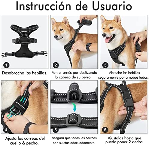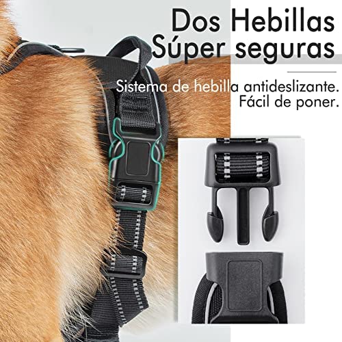 El arnés antitirones ha sido especialmente diseñado con dos anillos de metal de correa para pasear perros seguramente. El anillo de pecho sirve para el entrenamiento del perro y el otro en la espalda es para evitar tirar en paseos. Este arnés es muy fácil de poner y quitar, gracias a sus hebillas de liberación rápida. Las correas también tienen líneas reflectantes que ofrecen una buena visibilidad en la oscuridad.