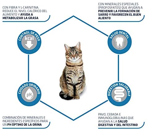 El producto es un alimento para perros con beneficios en la salud dental, control de peso, cuidado urinario y fácil digestión. Contiene minerales especiales para prevenir sarro y fibra con L-Carnitina para reducir el nivel calórico del alimento. También tiene una combinación de minerales para un pH óptimo de la orina, y ingredientes como pavo y cebada para la salud digestiva y del intestino. Viene en diferentes tamaños y está fabricado por Affinity.