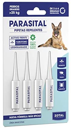 La pipeta antiparásitos para perros PARASITAL previene infestaciones de pulgas, garrapatas y repela el mosquito transmisor de la Leishmaniosis. Es eficaz y persistente sin ingredientes químicos. Se aplica una vez al mes en la zona donde el cuello y la espalda se unen y en la base de la cola.