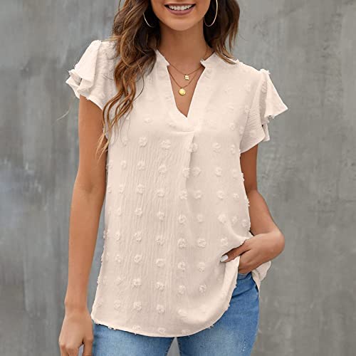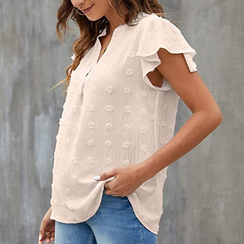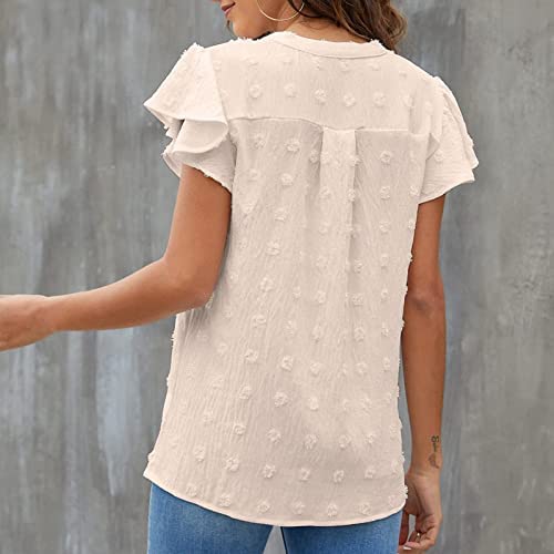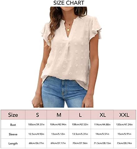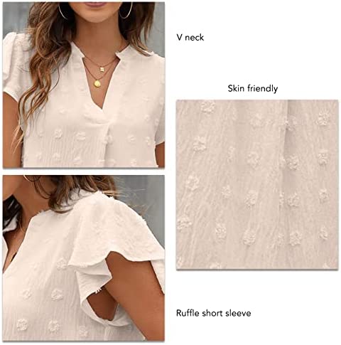 Blusa de mujer con manga corta y volantes, hecha de 100% poliéster, ligera y cómoda. Se puede combinar con diferentes prendas y es adecuada para diversas ocasiones, como trabajo, fiestas, vacaciones y uso diario. Viene en diferentes tamaños y colores.