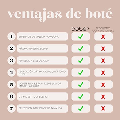 Las tiras para párpados invisibles de Boté son certificadas como amigables con la piel y efectivas para levantar los párpados. Su tecnología Boté Mash garantiza comodidad y seguridad, siendo totalmente invisibles y transpirables.