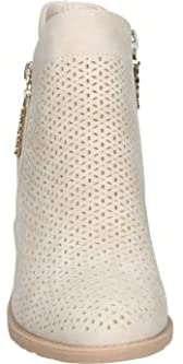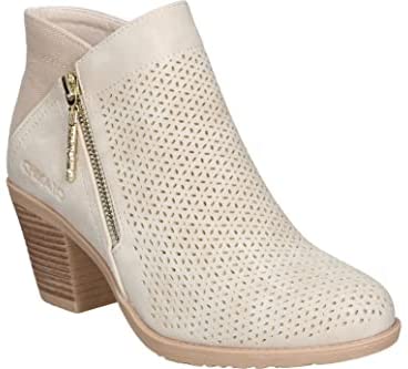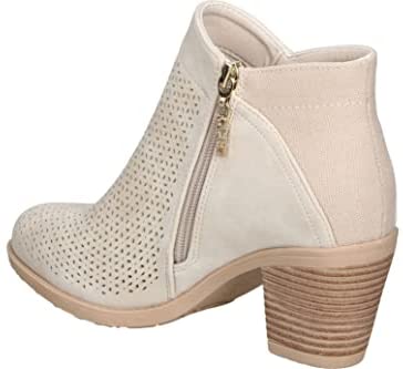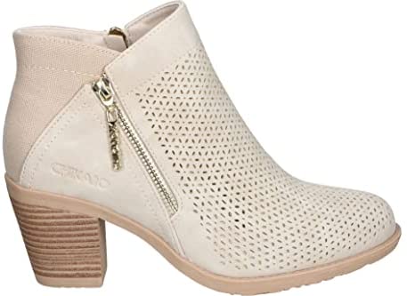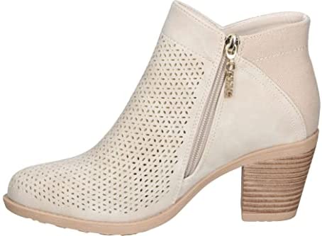 El botín de tacón de la marca española Chika10 tiene un diseño en beige con cremallera decorativa y patrón troquelado. Cuenta con una suela con tacón ancho efecto madera y plantilla acolchada para mayor comodidad. Disponible en Amazon.es.