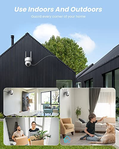 La cámara de vigilancia wifi exterior/interior tiene visión nocturna en color, campo de visión de 360° y seguimiento de IA, detección de movimiento y sonido, certificación IP66 y nube opcional/tarjeta SD para guardar videos. Compatible con IOS y Android, no es compatible con wifi 5G.