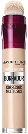 El corrector de ojeras fluido multiusos de Maybelline corrige imperfecciones, disimula ojeras y realza e ilumina la piel, además de atenuar arrugas. Tiene una corrección ultraprecisa, cobertura uniforme y acabado natural de larga duración. Su fórmula incluye bayas de goji y haloxyl para ralentizar el envejecimiento cutáneo, mientras que el aplicador de esponja recubierto por microfibras suaves llega a todas las imperfecciones. Viene en un tono light y tiene una cantidad de 6 ml.