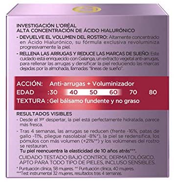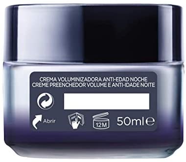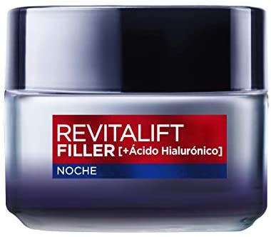 La crema de noche anti-edad de L’Oréal Paris Revitalift Filler tiene una fórmula rica en ácido hialurónico y extracto reafirmante de origen vegetal para restaurar el volumen del rostro y reducir arrugas. Después de 4 semanas, la piel está hidratada, tersa y los pómulos tienen más volumen. Se debe aplicar en el rostro y cuello limpios con movimientos ascendentes. El producto viene en un envase de 50 ml.