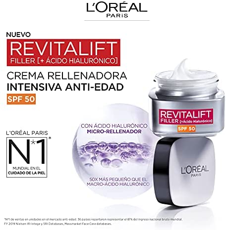 Crema intensiva con Ácido Hialurónico y SPF 50 de L’Oréal Paris para rellenar y proteger la piel del sol, con resultados juveniles.