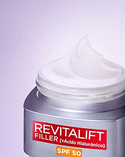 La crema rellenadora intensiva con Ácido Hialurónico y SPF 50 de L’Oréal devuelve volumen y protege la piel de los rayos UVB y UVA. Su fórmula con 3 tipos de ácido hialurónico hidrata y rellena las arrugas, luchando contra el fotoenvejecimiento y devolviendo 10 años de volumen a la piel. Ideal para pieles normales.