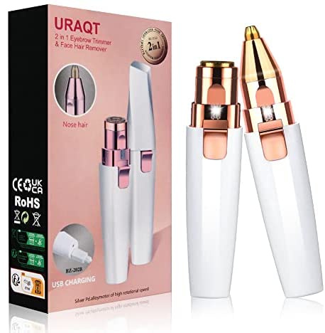 El recortador de cejas y depilador facial URAQT 2 en 1 es resistente al agua y fácil de limpiar. Ofrece dos tipos de cabezales para depilar y recortar cejas. Tiene luz LED para una mayor precisión y es recargable por USB. Es suave e indoloro y apto para todo tipo de pieles. Es portátil y elegante, perfecto para llevar de viaje.
