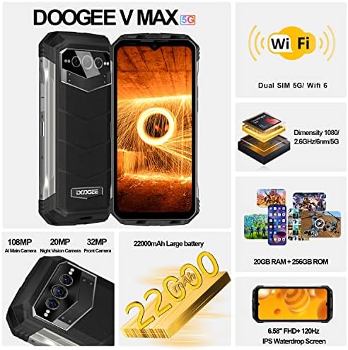 DOOGEE VMAX [2023] Teléfono 5G resistente al agua y golpes con batería de 22,000mAh, cámara triple de 108MP y pantalla de 6.6″ FHD+ 120Hz. Android 12 y características irrompibles como ip68ip69k, NFC y huella dactilar.