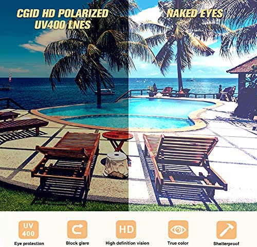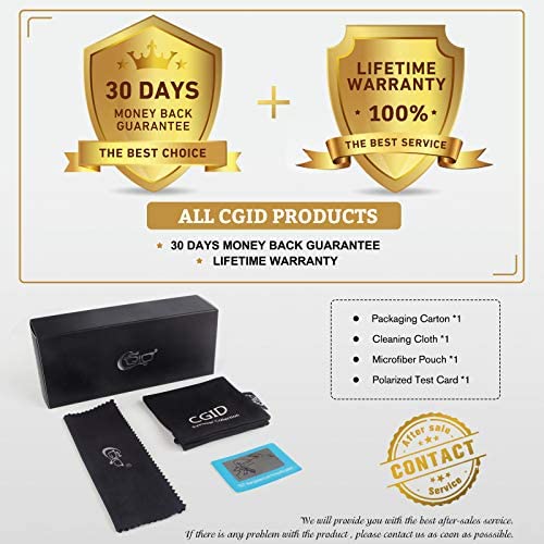 Las gafas de sol CGID protegen los ojos de los rayos UV400, utilizando lentes polarizadas que filtran el brillo. Además, tienen cuatro capas de protección, incluyendo un revestimiento antiaceite. Son elegantes y vienen con una garantía de por vida y devolución de dinero de 30 días.