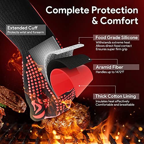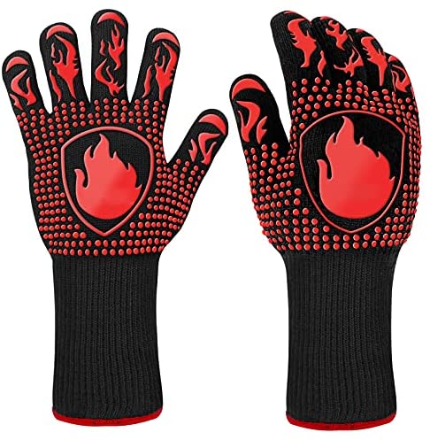 Los guantes de barbacoa profesionales resistentes al calor de hasta 800℃ proporcionan la mayor protección para cocinar a la parrilla, hornear y más. Con diseño de 5 dedos, silicona antideslizante, forro de algodón transpirable y lavable. Incluye servicio posventa de 24 meses.