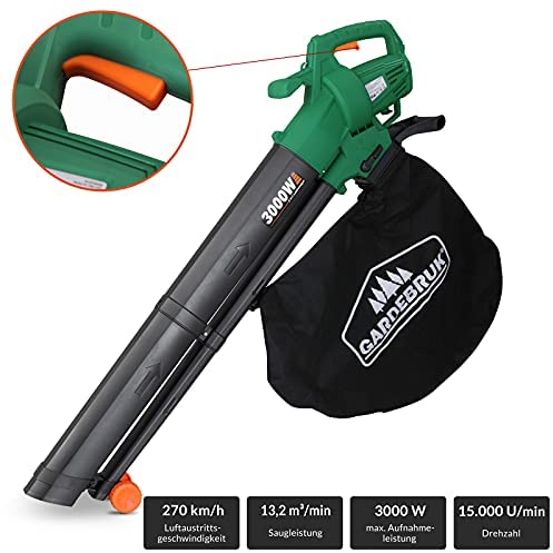 La trituradora, soplador y aspiradora de jardín 3 en 1 es una herramienta multifuncional con un potente motor de 3000W para limpiar grandes superficies y triturar hojas y ramas en la bolsa de recogida de 45L. Viene con una correa para el hombro y ruedas en el tubo de aspiración para facilitar su uso. Es fácil de vaciar y cuenta con certificación de seguridad aprobada por TÜV Süd GS.