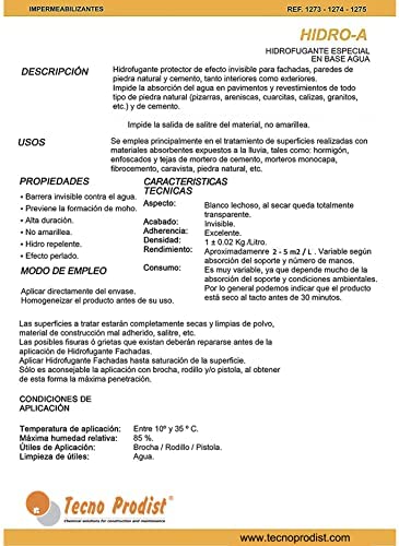 HIDRO A es un impermeabilizante transparente al agua y hidrofugante incoloro que protege fachadas, techos, paredes, muros, tejas, ladrillos y piedra. Repelente de agua a base de polisiloxanos y silanos, fácil de aplicar con brocha, rodillo, pulverizador o mochila de sulfatar. Ofrece gran penetración y flexibilidad, y mantiene el aspecto natural de las superficies. Disponible en varios tamaños y adecuado para materiales porosos como la piedra, así como para uso en interiores y exteriores. Producto de última generación de la marca Tecno Prodist.