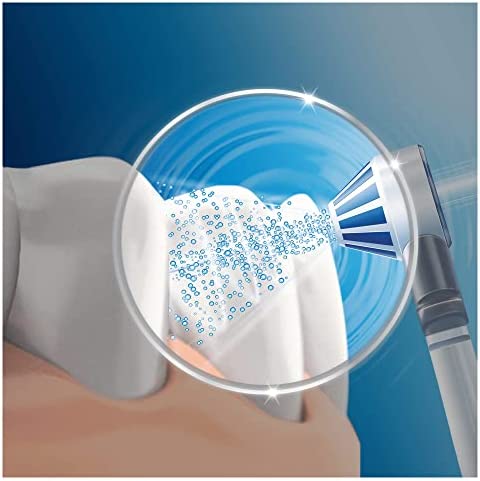 El irrigador Oxyjet de Oral-B ofrece una limpieza profunda y cuidado de las encías gracias a su tecnología de microburbujas. Es ajustable y puede utilizarse con o sin enjuague bucal como complemento al cepillado diario.