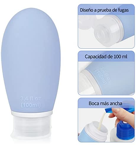 El set incluye cuatro botellas con capacidad de 100ml cada una. Estas botellas son ideales para llevar tus productos de cuidado personal en tus viajes largos, ya que su tamaño es pequeño pero su capacidad es grande.
