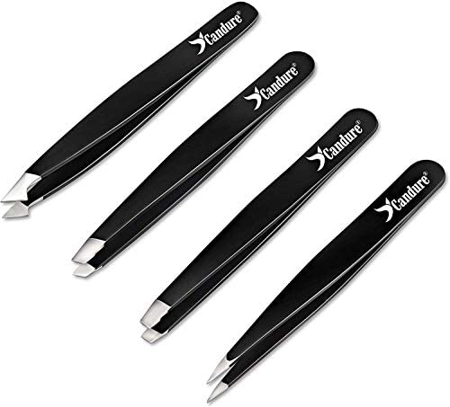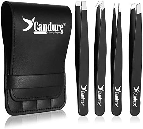 Candure ofrece un set de pinzas de alta calidad, incluyendo pinzas para cejas inclinadas, puntiagudas y planas, para eliminar pelos encarnados, astillas y mantener las cejas en forma. Viene en un estuche de cuero, ideal para regalar.