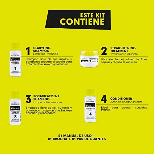 Además, el kit de alisado es apto para todo tipo de cabellos y es muy fácil de usar en casa, ya que viene con todo lo necesario: un champú de limpieza profunda, el tratamiento alisador, un champú de limpieza reparadora y un acondicionador, así como instrucciones, una brocha y unos guantes.