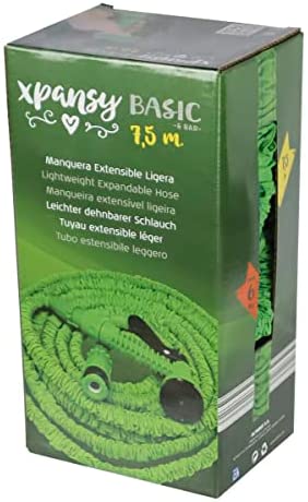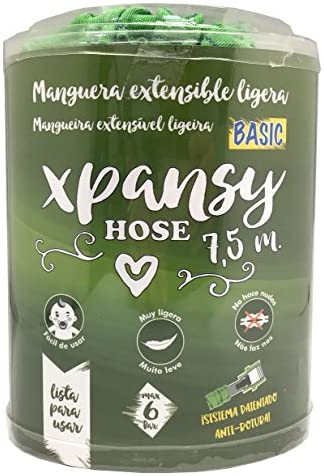 La manguera Xpansy Basic es ligera y práctica, extensible hasta 7,5 metros con presión de agua. Incluye conectores patentados y una pistola con 7 patrones de riego. Su tubo interior va sujeto por dentro para evitar roturas en la zona de la abrazadera.