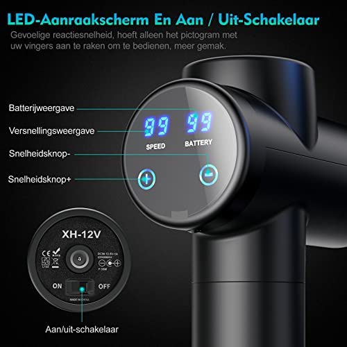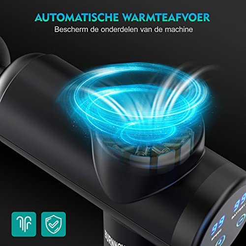 La Pistola de Masaje BURNNOVE es ultra silenciosa y cuenta con una pantalla táctil LED que muestra los cambios y el porcentaje de la batería. Es recargable y, después de una carga completa, puede trabajar durante 10 horas en la marcha más baja.