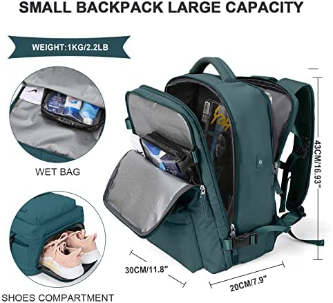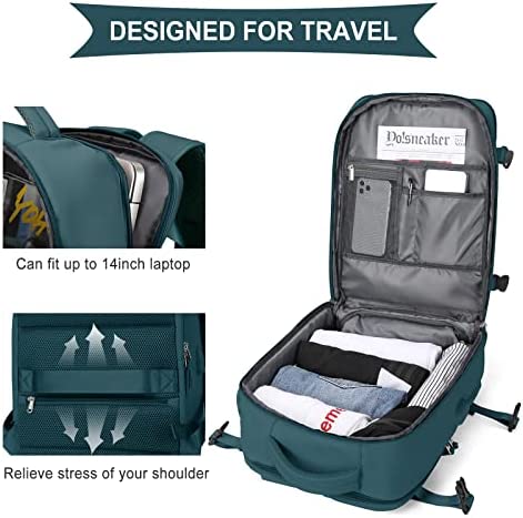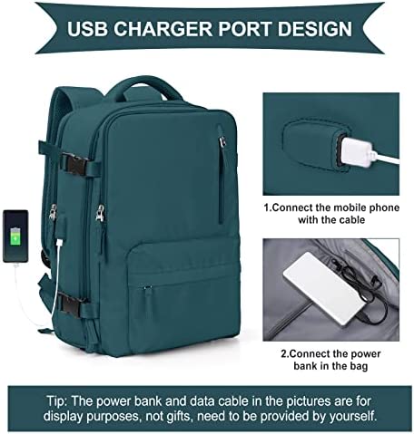La mochila de viaje grande está hecha de poliéster resistente al agua y cuenta con dos correas de hombro acolchadas para reducir la presión. Posee un compartimento separado para zapatos y una bolsa húmeda, un puerto de carga USB y un bolsillo anti-robo en la parte posterior.