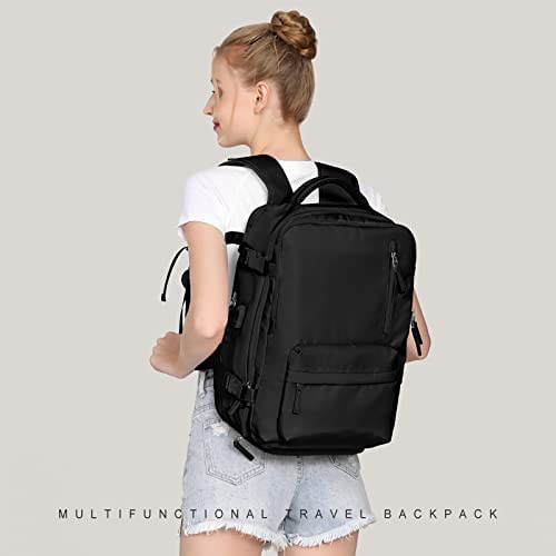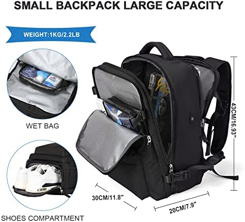 La mochila de viaje grande está hecha de poliéster resistente al agua y cuenta con correas de hombro acolchadas para aliviar la presión. También tiene un compartimento separado para zapatos y una bolsa húmeda, además de un puerto de carga USB y un bolsillo trasero antigoteo para objetos valiosos.