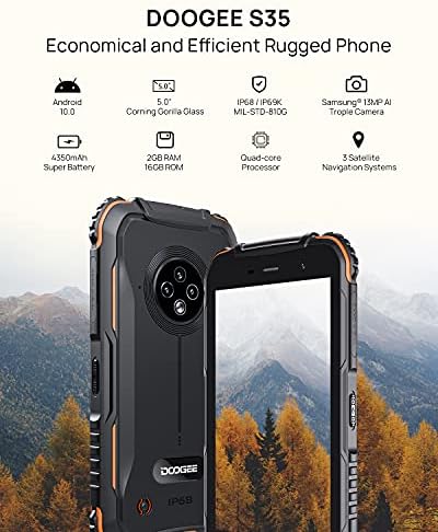 El teléfono móvil DOOGEE S35 es resistente al agua, polvo y golpes, con una pantalla Corning Gorilla Glass de 5.0 pulgadas y una batería de 4350 mAh. También cuenta con una cámara triple de 13MP + 2MP + 2MP, 16 GB de ROM, Android 11 y dual SIM. Viene con 2 años de garantía.