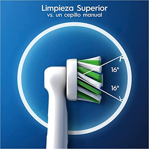 El CrossAction de Oral-B es uno de sus cabezales de alta gama, con filamentos en un ángulo de 16 grados para eliminar hasta un 100% más de placa que un cepillo de dientes manual normal. Los cabezales mejorados incluyen la tecnología CleanMaximiser para una limpieza óptima. Compatible con todos los mangos Oral-B, excepto Pulsonic e iO.
