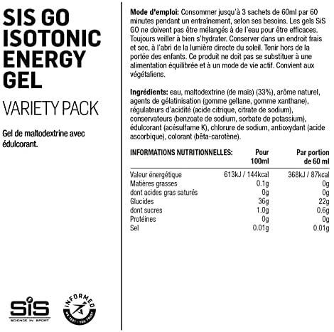 Los geles energéticos de Science in Sport, el fabricante del Gel GO Energía Isotónica, son también aprobados para veganos, ya que no contienen gluten y sus sabores son naturales, tienen sodio añadido, maltodextrina y 87 kcals por porción. Science In Sport es una empresa líder en nutrición deportiva y colabora con institutos de investigación, atletas de élite, directores de rendimiento y científicos que avalan la marca para deportistas.