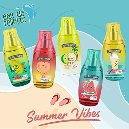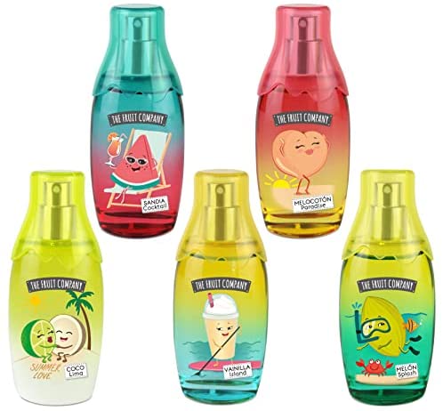 El Pack Summer Collection de 5 Colonias The Fruit Company ofrece fragancias irresistibles para el verano, como Dulce Vainilla, Coco Lima, Melón, Melocotón y Sandía Cocktail. Cada colonia contiene 40 ml y tiene una fórmula concentrada con perfumes de calidad. Se recomienda pulverizar a una distancia de 5 cm del cuerpo y no usar en niños menores de 3 años.