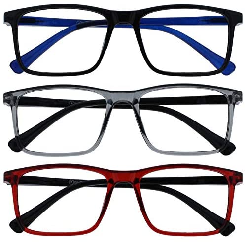 Se trata de un set de tres pares de gafas de lectura para hombres y mujeres de talla grande. Cada par cuenta con un marco rectangular resistente a los arañazos, cómodo ajuste y bisagras de resorte. Con potencia +1,00 y disponibles en color negro, gris y rojo oscuro.