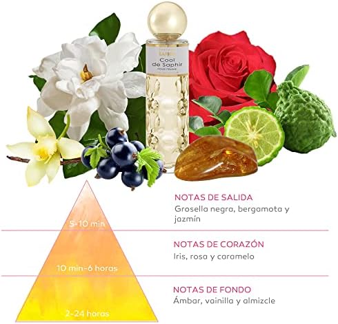 La fragancia femenina de Saphir tiene notas de grosella negra, iris y ámbar, que la hacen sofisticada y sensual. Es duradera y cómoda de usar diariamente con su envase de 200 ml con pulverizador.