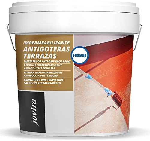 Pintura impermeabilizante fibrada JOVIRA PINTURAS, revestimiento elástico para terrazas, paredes, medianeras y tejados. Disponible en gris con fibras, 5 kg.