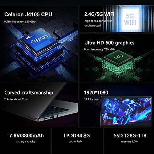 El KUU Portátil Windows 11 tiene un procesador Celeron J4105 de 4 núcleos y 4 subprocesos, 8GB DDR4 RAM y 256GB SSD. La pantalla es de 14.1 pulgadas con una resolución de 1920×1080 y el peso es de solo 1.25 kg. Cuenta con una batería grande de 7.6V/3500mWh y varios puertos, incluyendo USB 2.0 y 3.0, mini HDMI y conector para auriculares. Viene con un año de garantía y servicio al cliente de por vida.