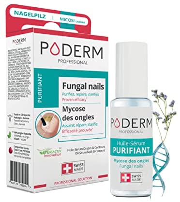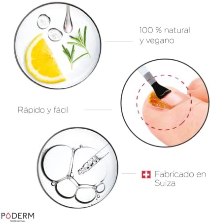 El aceite-sérum purificante Poderm Professional es un tratamiento totalmente natural para combatir eficazmente los hongos en uñas y uñas amarillentas. Contiene 12 aceites y aceites esenciales BIO seleccionados por su eficacia y propiedades antifúngicas, purificantes, nutrientes y reparadoras. Además, su aplicación es simple y rápida con un pincel y debe ser utilizado diariamente mañana y noche durante 1-3 meses para uñas de la mano y 1-4 meses para uñas del pie para obtener un resultado óptimo y duradero. Este producto es seguro y sin riesgos para toda la familia, mujeres embarazadas y diabéticos y ha sido desarrollado por una dermatóloga suiza.