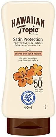 Hawaiian Tropic Satin es una loción protectora solar que, además de proteger contra los rayos UVA y UVB, nutre e hidrata la piel con vitaminas C y E para un brillo saludable. La fórmula no es grasa y tiene una fragancia refrescante de coco. Resistente al agua hasta 80 minutos, disponible en SPF 15, 30 y 50. Este paquete contiene una botella de 180 ml de protector solar SPF50.