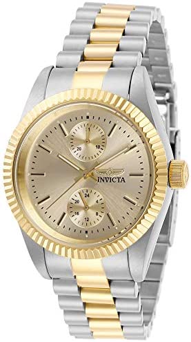 El Invicta 29442 es un reloj para mujer que forma parte de la colección Invicta Specialty. Este modelo tiene una caja de acero inoxidable de 36 milímetros y una esfera color champán que le da un toque elegante y sofisticado.