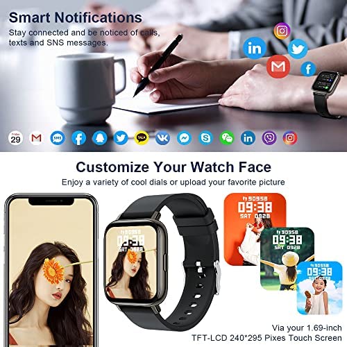 El reloj inteligente para mujer también viene con una pantalla táctil completa de 1.69 pulgadas que proporciona una profundidad de color increíble y una claridad excepcional. Y con la opción de personalizar la esfera del reloj con más de 100 diseños o con tus propias fotos, podrás tener siempre la motivación necesaria para alcanzar tus objetivos.