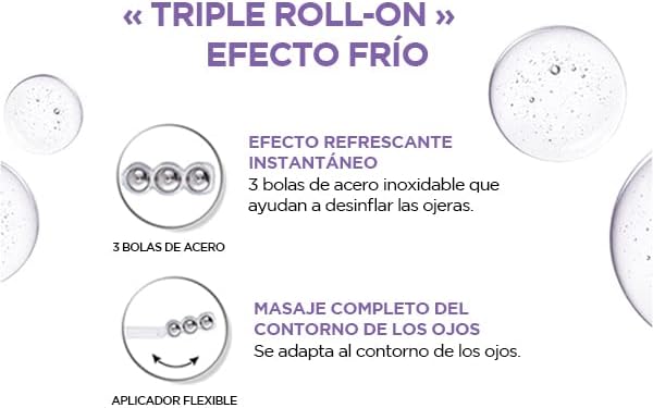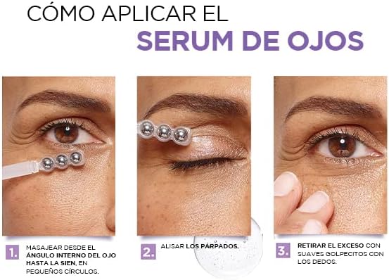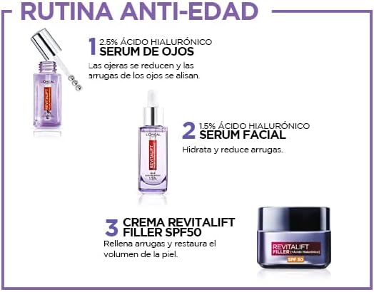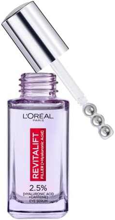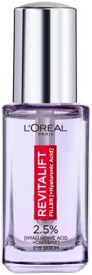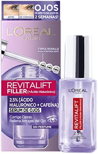El Sérum de ojos Revitalift Filler con Ácido Hialurónico de L’Oréal Paris reduce las líneas alrededor de los ojos y corrige las ojeras, hidratando intensamente la piel y alisando las arrugas. Con un aplicador triple roll-on efecto frío, esta fórmula aprobada por dermatólogos incluye Cafeína para reducir las bolsas. Un estudio clínico en 81 mujeres demostró una reducción del 21% en las líneas de los ojos después de 6 semanas de uso.