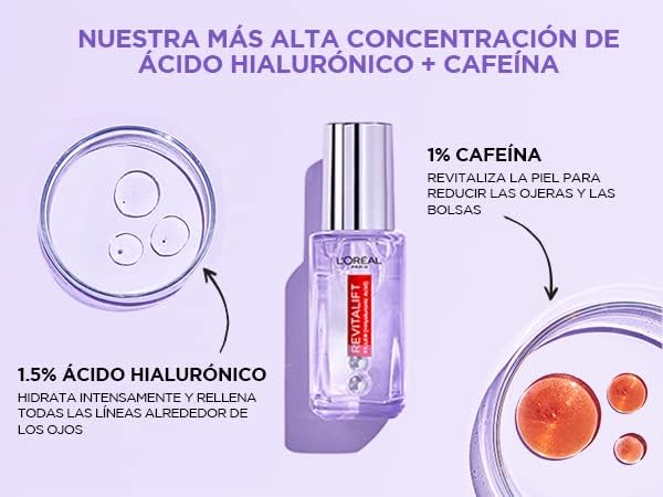 La fórmula de este sérum incluye ácido hialurónico, que ayuda a hidratar la piel, y cafeína, que revitaliza la piel y reduce las bolsas debajo de los ojos. El producto ha sido aprobado por dermatólogos del comité asesor de L’Oréal Paris.